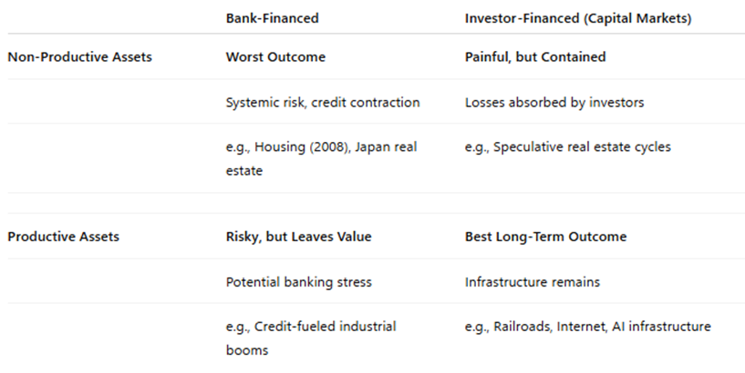 A cycle where banks are heavily involved in lending against assets that do not produce anything tends to end poorly and linger. A cycle where capital markets fund productive investment can still be painful for investors, but it often leaves behind something useful.